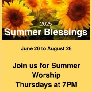 We pray you will find us to be an oasis in your spiritual journey. Each week we gather to worship on Sunday 10:30am (Thursday evenings at 7pm in July and August). We hope you will join us.